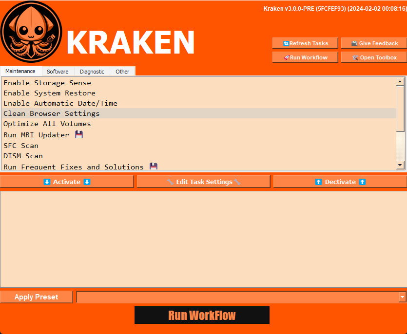 Kraken works in tandem with the MRI toolset to help Geek Squad agents do repairs more quickly, efficiently, and consistently. It has the ability to automate entire repairs from beginning to end, and has presets for various situations such as a routine tune-up clean-up, first time set-up, etc.